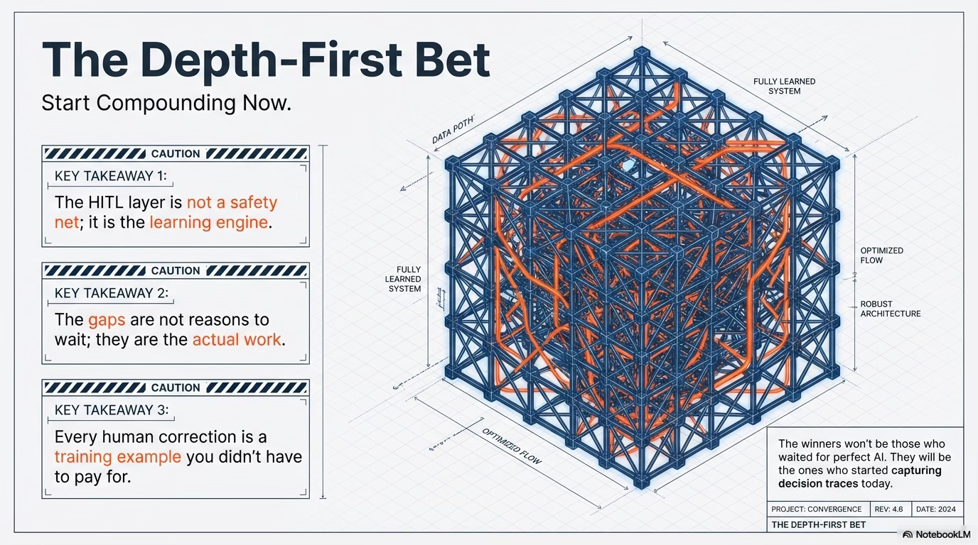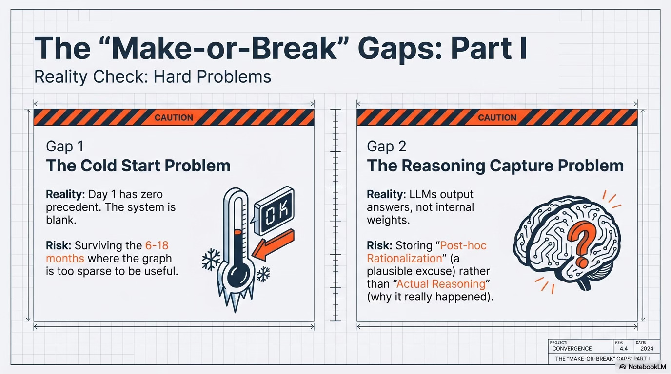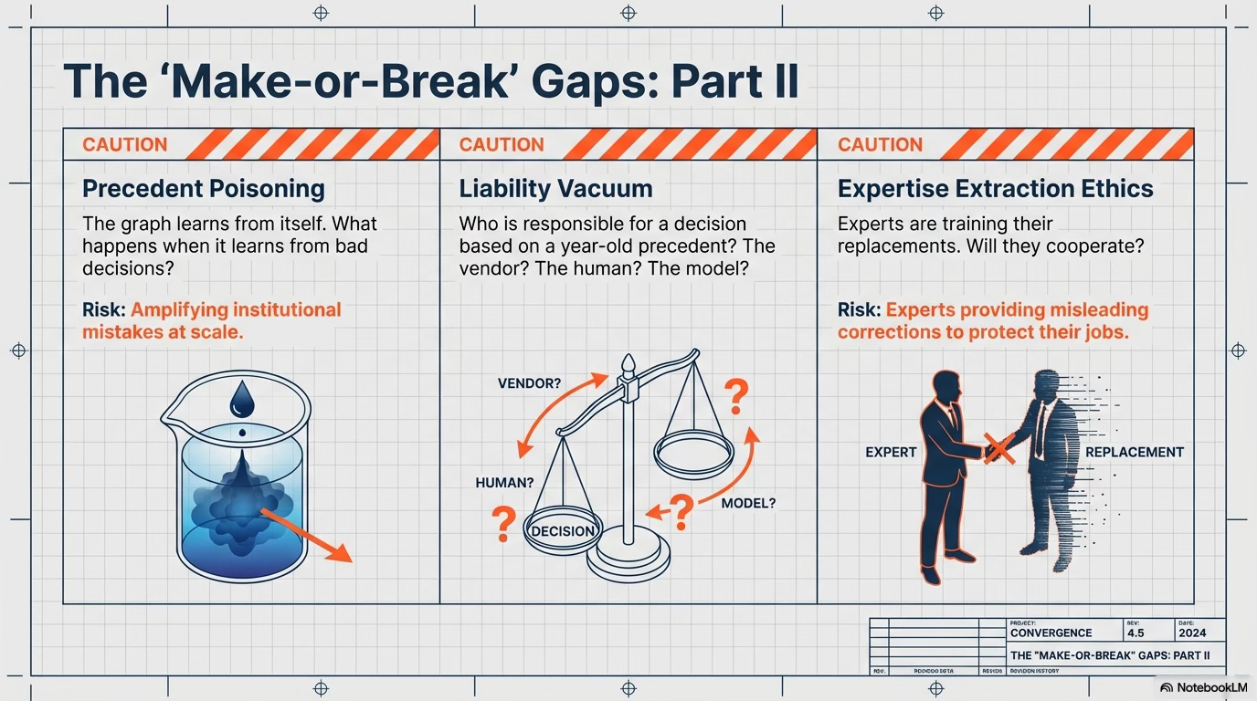 The gaps in the thesis aren’t reasons to wait - they’re the actual work. Cold start, reasoning capture, precedent poisoning, expertise extraction, liability - these aren’t theoretical problems. They’re the engineering and organisational challenges that will separate the winners from the case studies nobody writes.