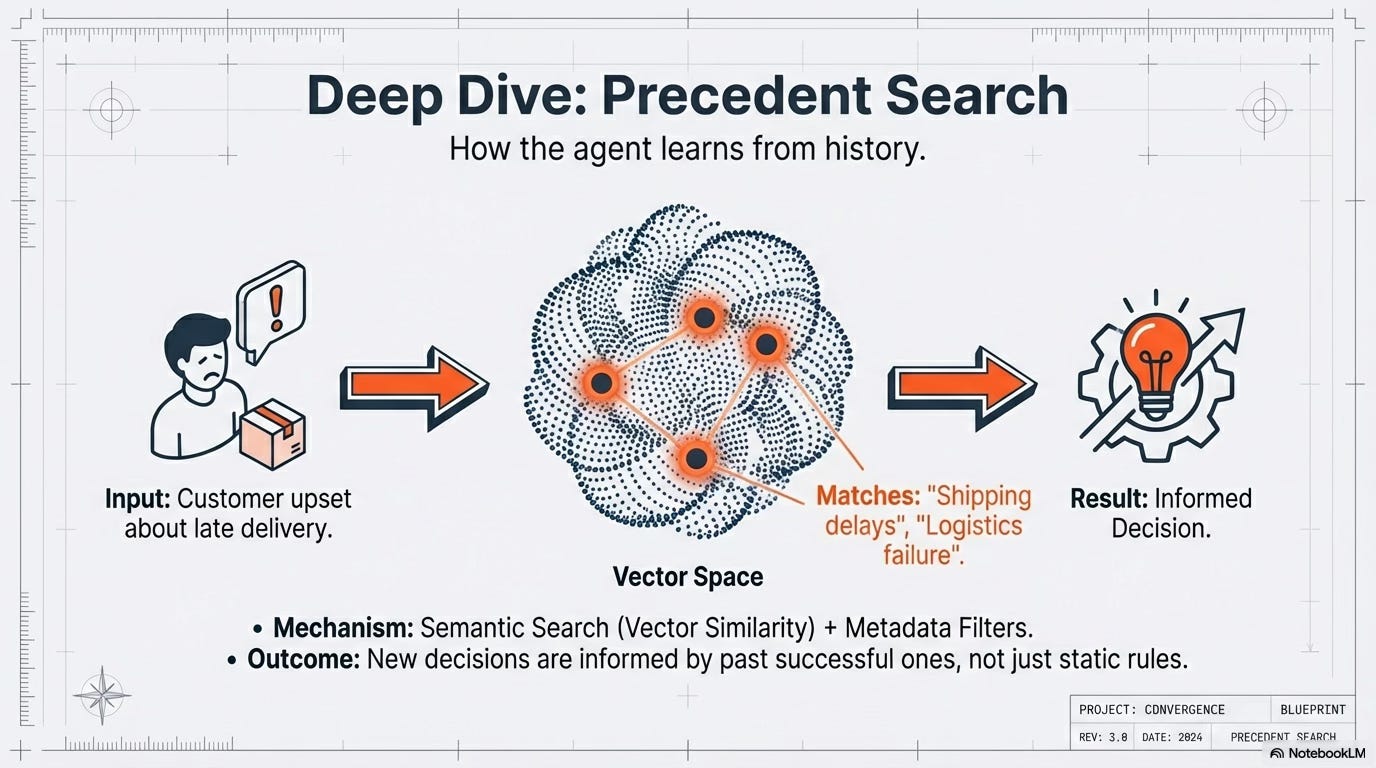 Your agent faces an edge case. It searches for similar decisions. Nothing. It makes a guess. The guess might be wrong. The customer is upset. The human overrides. Now you have one data point.