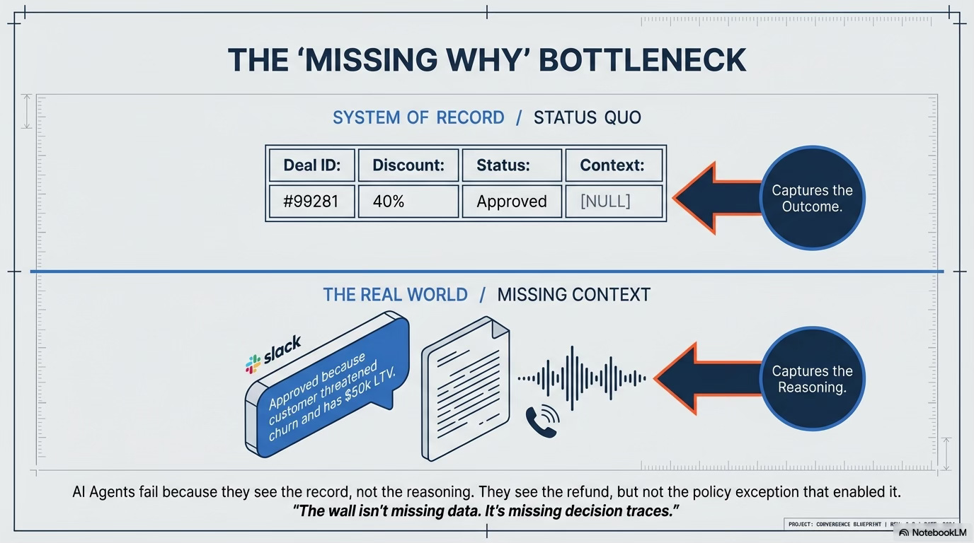 “Agents run into the same ambiguity humans resolve every day with judgment and organizational memory. The wall isn’t missing data. It’s missing decision traces.”