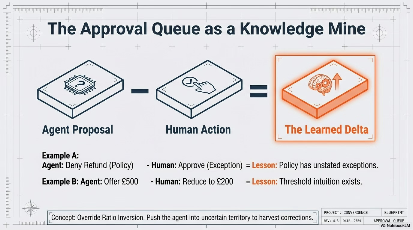 What if you wanted a 30% override rate rather than 5%? Not because your agent is bad, but because you’re deliberately pushing it into uncertain territory to harvest corrections. The agent becomes a hypothesis generator, and humans become hypothesis validators. You’re not automating work - you’re mining expertise.