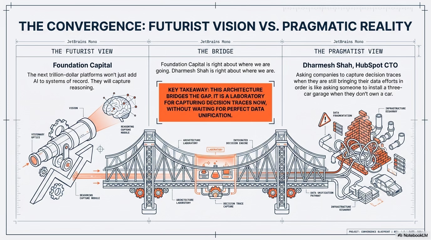 Shortly after, HubSpot CTO Dharmesh Shah ( dharmesh ) weighed in with a characteristically pragmatic take: the idea is “elegant, intellectually compelling,” but most companies are still struggling with basic data unification. “Asking companies to capture decision traces when they are still bringing their data efforts in order,” Shah wrote, “is sort of like asking someone to install a three-car garage when they don’t own a single car.”