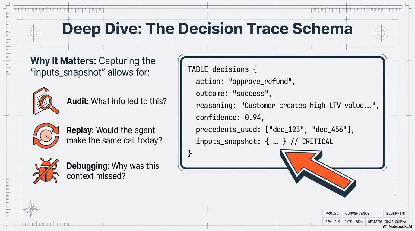 This is the core innovation of context graphs. Every decision captures: