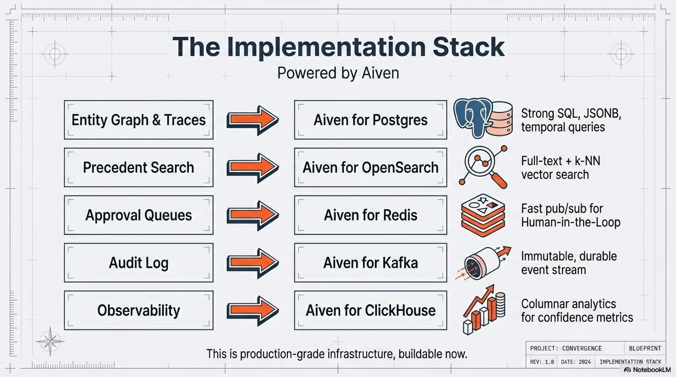 This code tries to bridge that gap. It’s not a production system - it’s a laboratory for exploring what context graphs actually look like in code. Inspired by Shah’s recent Linkedin posts on coding and how he codes relentlessly nowadays, this weekend I have built a working implementation using Aiven’s managed infrastructure stack (Postgres, OpenSearch, Redis, Kafka, ClickHouse) so we can see how guardrails, decision traces, precedent search, and observability actually stitch together. My approach to learning is by doing and since last one year I have immersed myself into completing many coding / vibe-coding assignments. This is my attempt to study foundation capital’s approach and what will be the challenges in having a bolt-on approach that can be taken by incumbents.